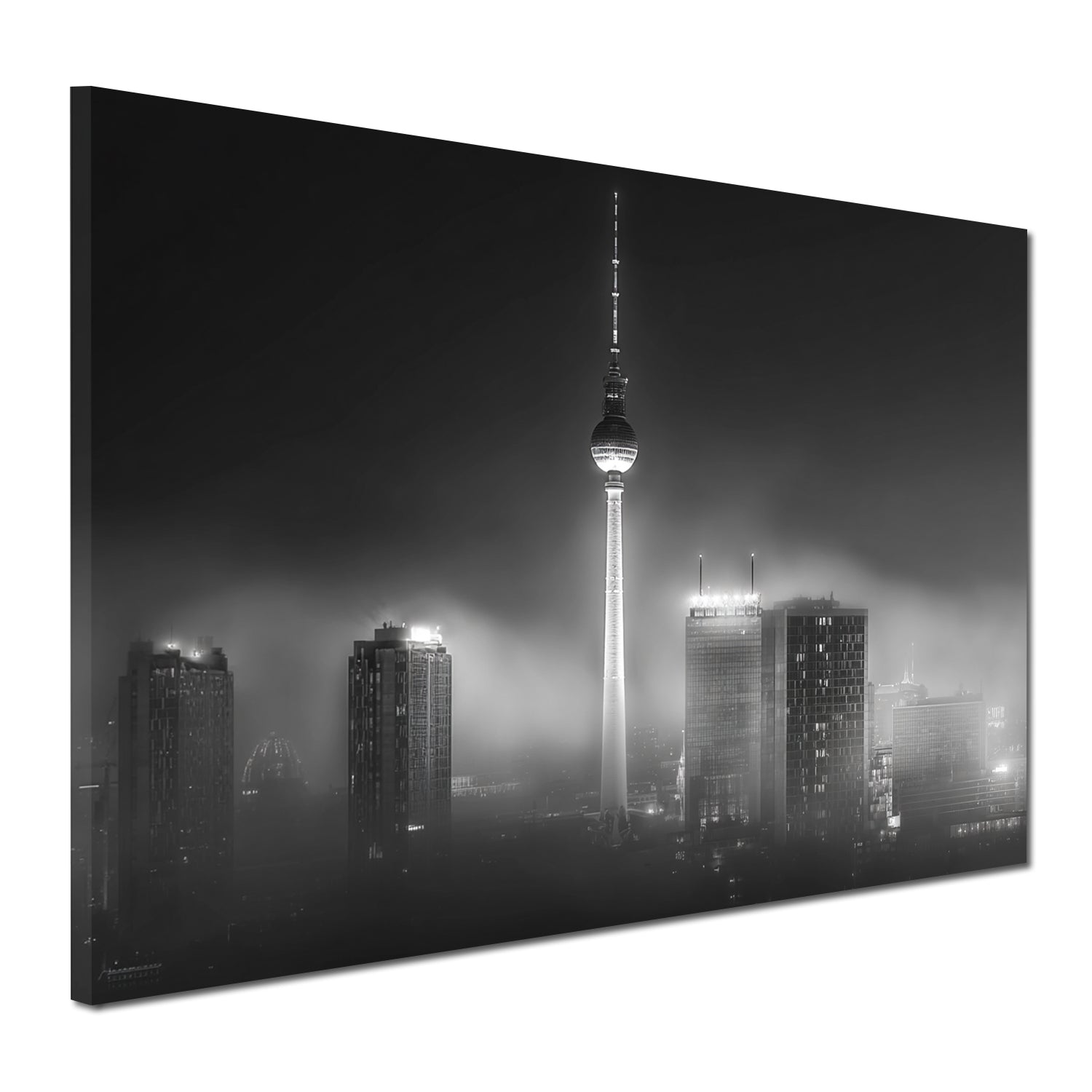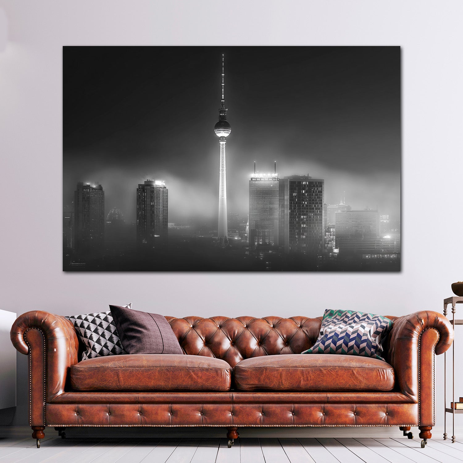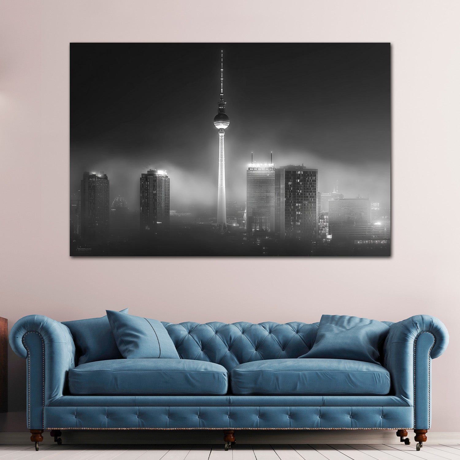 Berliner Fernsehturm schwarz weiß Skyline im Nebel Wandbild