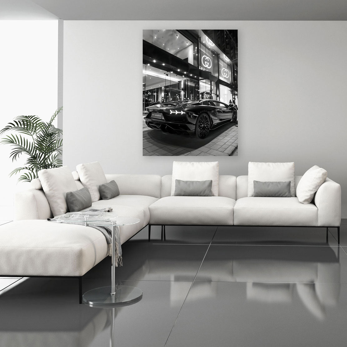 Lamborghini Sportwagen schwarz weiß Gucci Store Wandbild