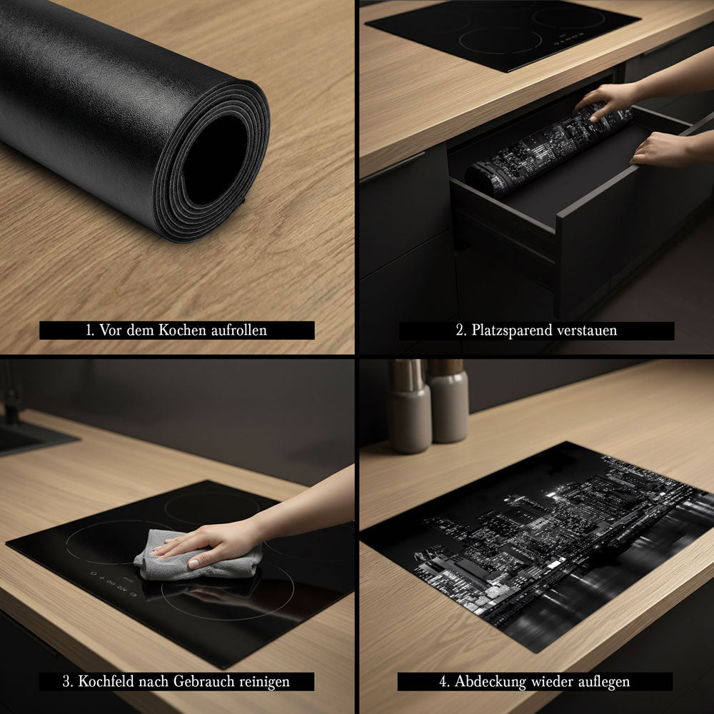Als passgenaue Abdeckung bewahrt die Vinyl-Herdabdeckplatte Ihr Induktions- oder Ceranfeld vor Kratzern, Staub und Gebrauchsspuren. Gleichzeitig verschwindet das Kochfeld dezent aus dem Blickfeld, wenn es nicht genutzt wird – für eine ruhige, ordentliche und sichere Küchenoptik.